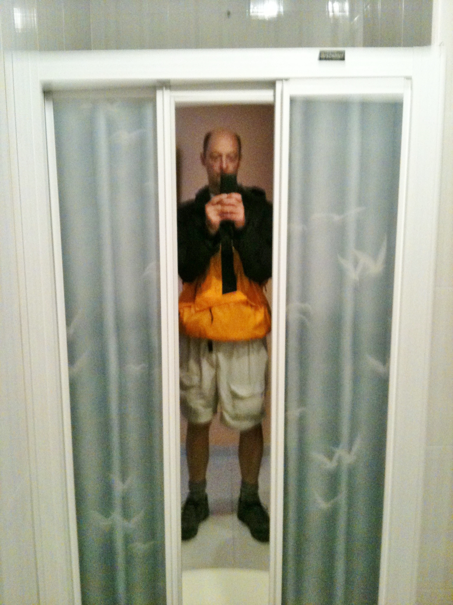 It’s supposed to rain tomorrow and he’s going to have to give it up and figure out how to use his rain gear for his shoes. I know he’s disappointed since he got so close without having to use them. The other challenge he had today was trying to figure out how to use the shower. He just couldn’t get it to work so he gave it up and took “a damned bath.”