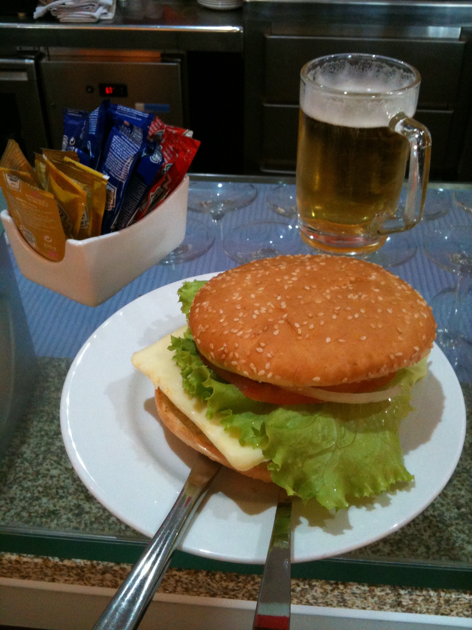 Upon arriving at last night’s hotel in Palas de Rei (Complejo La Cabana) he treated himself to a hamburguesa completo (a hamburger with everything) and a beer. He said it hit the spot. The hotel was supposedly designed to look like an alpine chalet. His room had a pair of bunk beds next to his twin one (three beds for his “single” reservation) and that didn’t help evoke the theme. The several cats out hunting in the fields (nice to know they had Keith’s back) weren’t on skis so they didn’t fit the theme either.